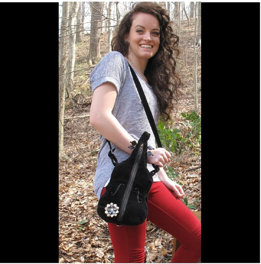 This lush velvet Violin Purse has two pockets on the back and two inside. The inside also has a carabiner key hook , pencil loop and clever loop that can hold eye glasses or a violin chin rest. It comes with a small black leather wallet. The back lower pocket has a division and the flap folds up to close.
